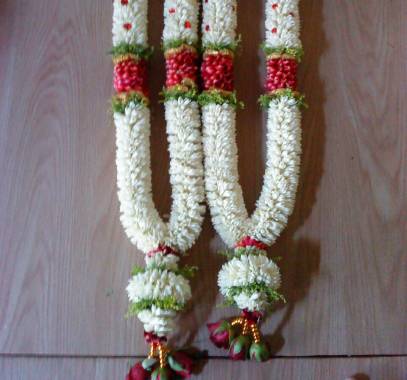 Customized floral garlands for the bride, groom, family members, and rituals—crafted using fresh flowers and matching the wedding theme.