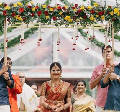 Creative couple entry ideas such as floral chariots, fog walks, cold pyros/fireworks, umbrella entries, or thematic vehicle entries for a grand arrival.